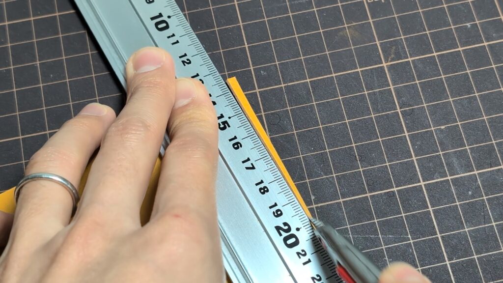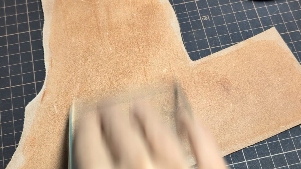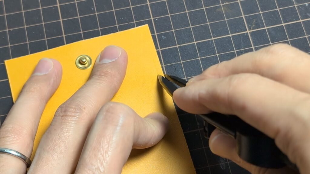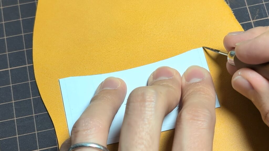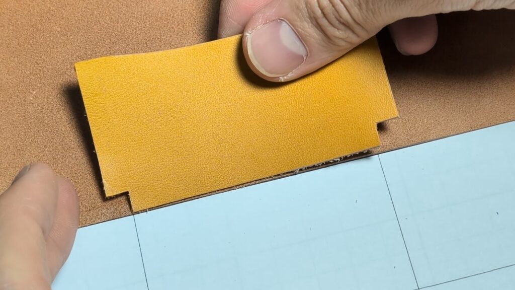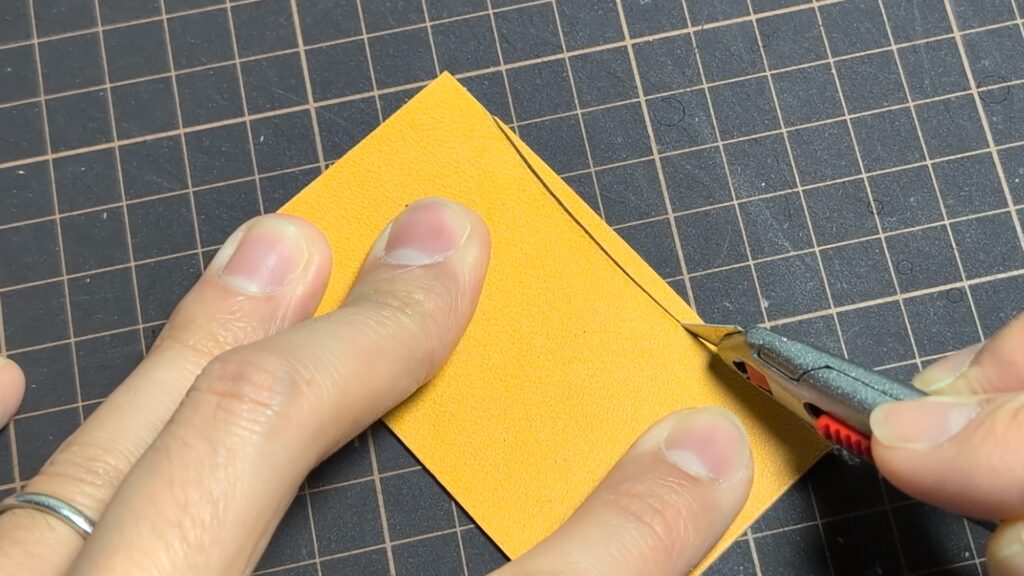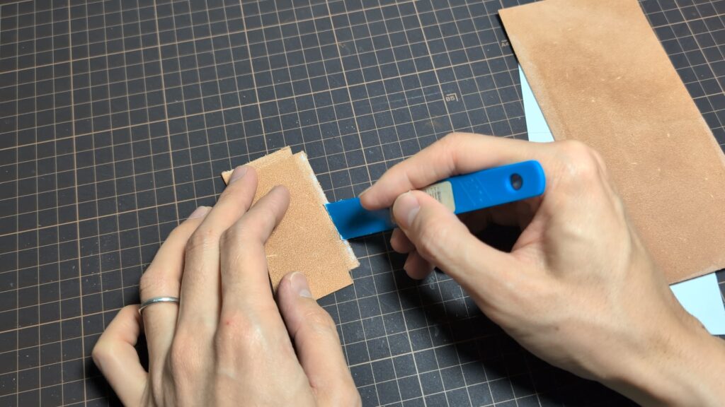 もし貼り合わせた際に革の端が飛び出していたり、段差ができていたりする場合は、線を引く前にカッターなどで薄く切り落として、断面をフラットに整えておきましょう!