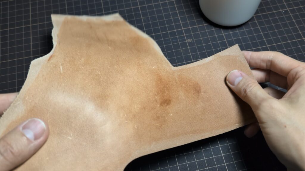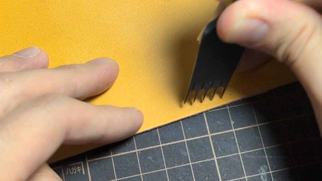 ここで特に注意したいのが、革の柔らかさです。柔らかい革の場合、強くけがこうとすると針先に引っ張られて革が伸び、形が歪んでしまうことがあります。仕上がりのサイズがズレる原因になるため、革を伸ばさないよう、優しく慎重になぞるのがポイントです。