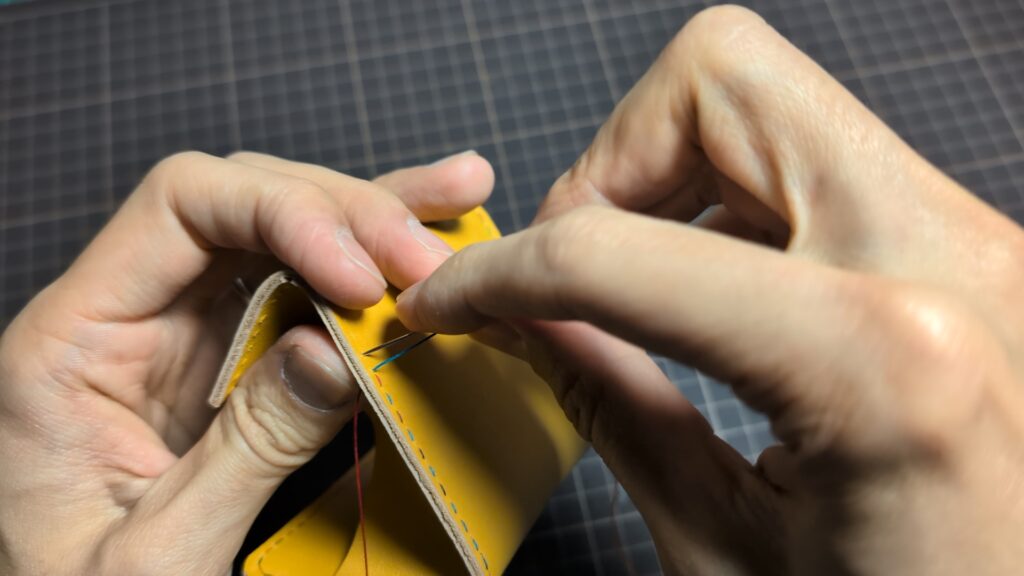 曲線部分は特に慎重に!革を少しずつ回しながら、コバから針が外れないよう「面」で捉えるイメージで動かすと、角の丸みも美しく線を引くことができます!
