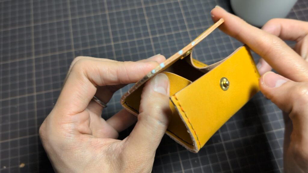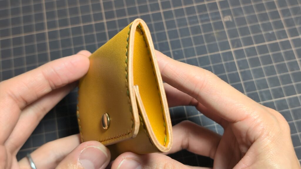床面が整っていると、見た目が美しくなるだけでなく、カードや小銭の出し入れがスムーズになり、作品全体の耐久性も向上します。仕上げ剤を薄く均一に塗り広げ、ガラス板やウッドスリッカーを使って、革の繊維を寝かせるように丁寧に磨き上げましょう。