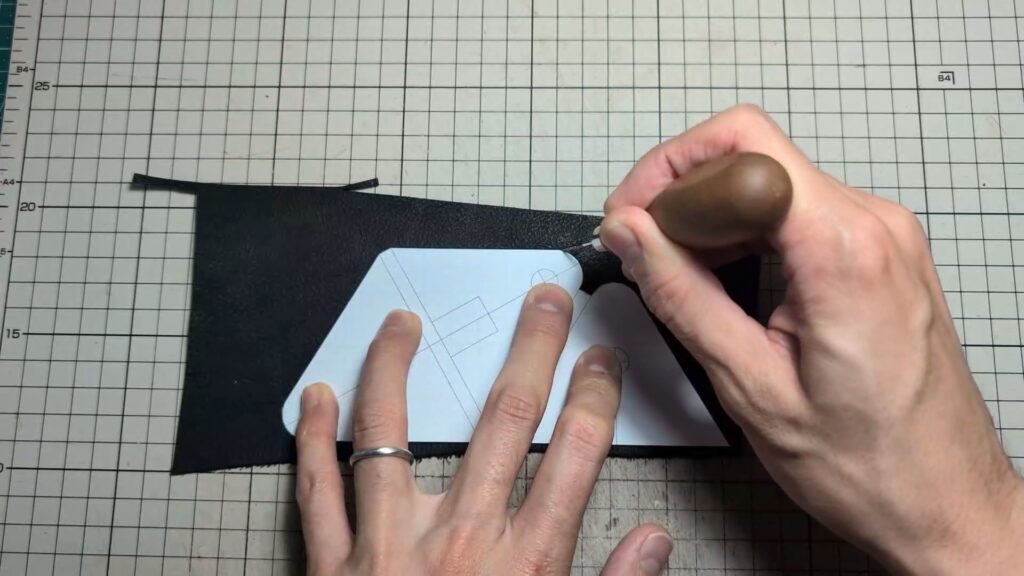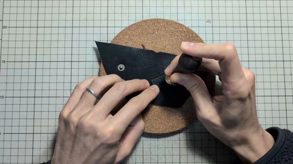 線からズレないよう、最初は菱目打ちを軽く当てて印をつけ、穴の位置やピッチ(間隔)を調整しながら進めていきましょう。特に、菱目の向きや、縫い終わりの穴が中途半端な位置にならないよう、事前の確認が大切です。