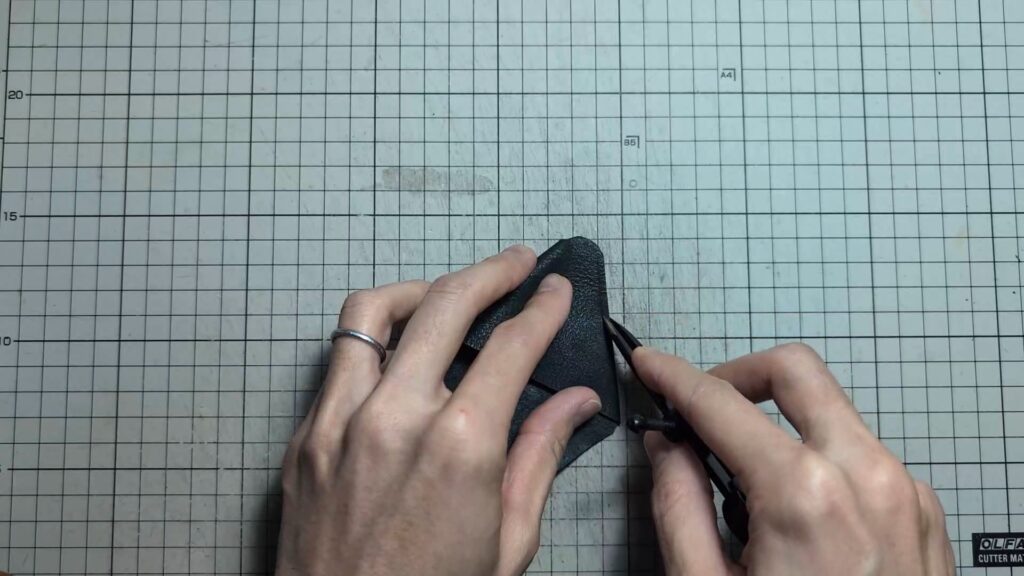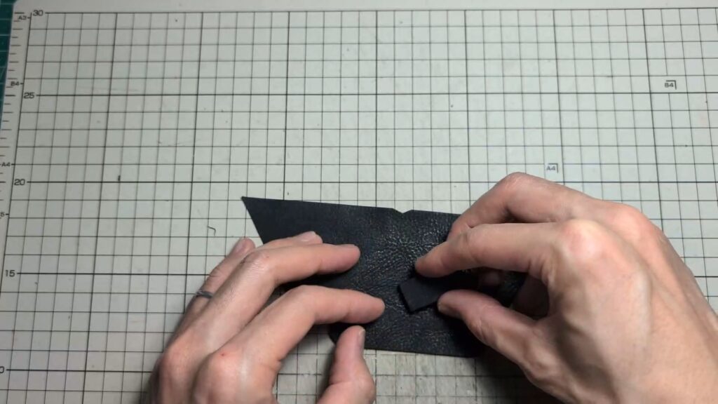 もし貼り合わせた際に革の端が飛び出していたり、段差ができていたりする場合は、線を引く前にカッターなどで薄く切り落として、断面をフラットに整えておきましょう!