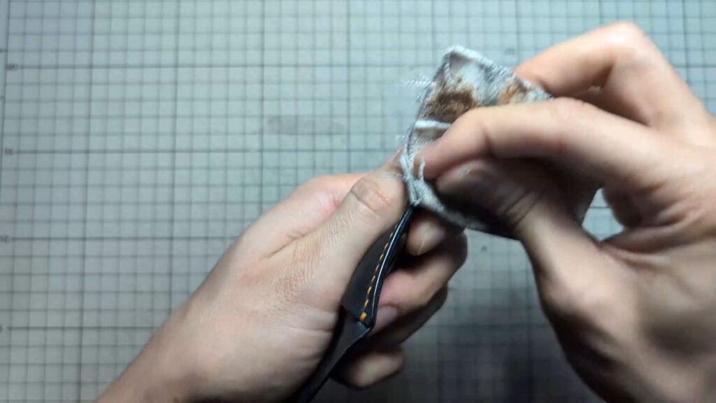 下地がしっかり整ったら、仕上げに再度コバ処理剤を薄く塗り、帆布(はんぷ)やスリッカーを使って一気に磨き上げていきましょう。革の繊維がギュッと引き締まり、美しい光沢が生まれる瞬間は、まさにレザークラフトの至福の時です。